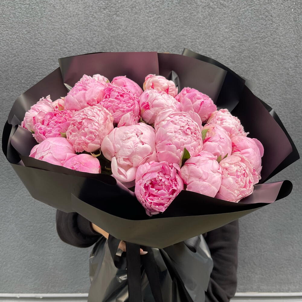 Голландська півонія сорту Sarah Bernhardt в чорному стильному пакуванні.