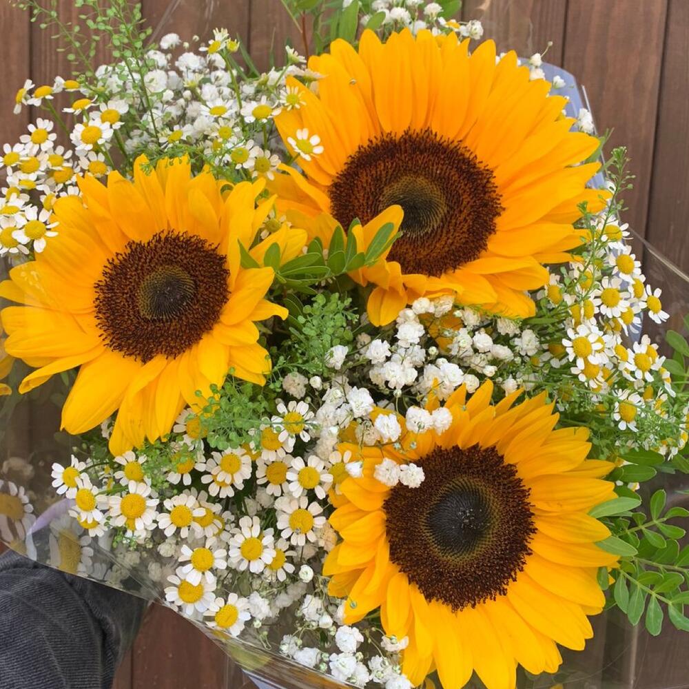 Букет подсолнухов с ромашками ( матрекарией), гипсофилой, тиласпией и зеленью