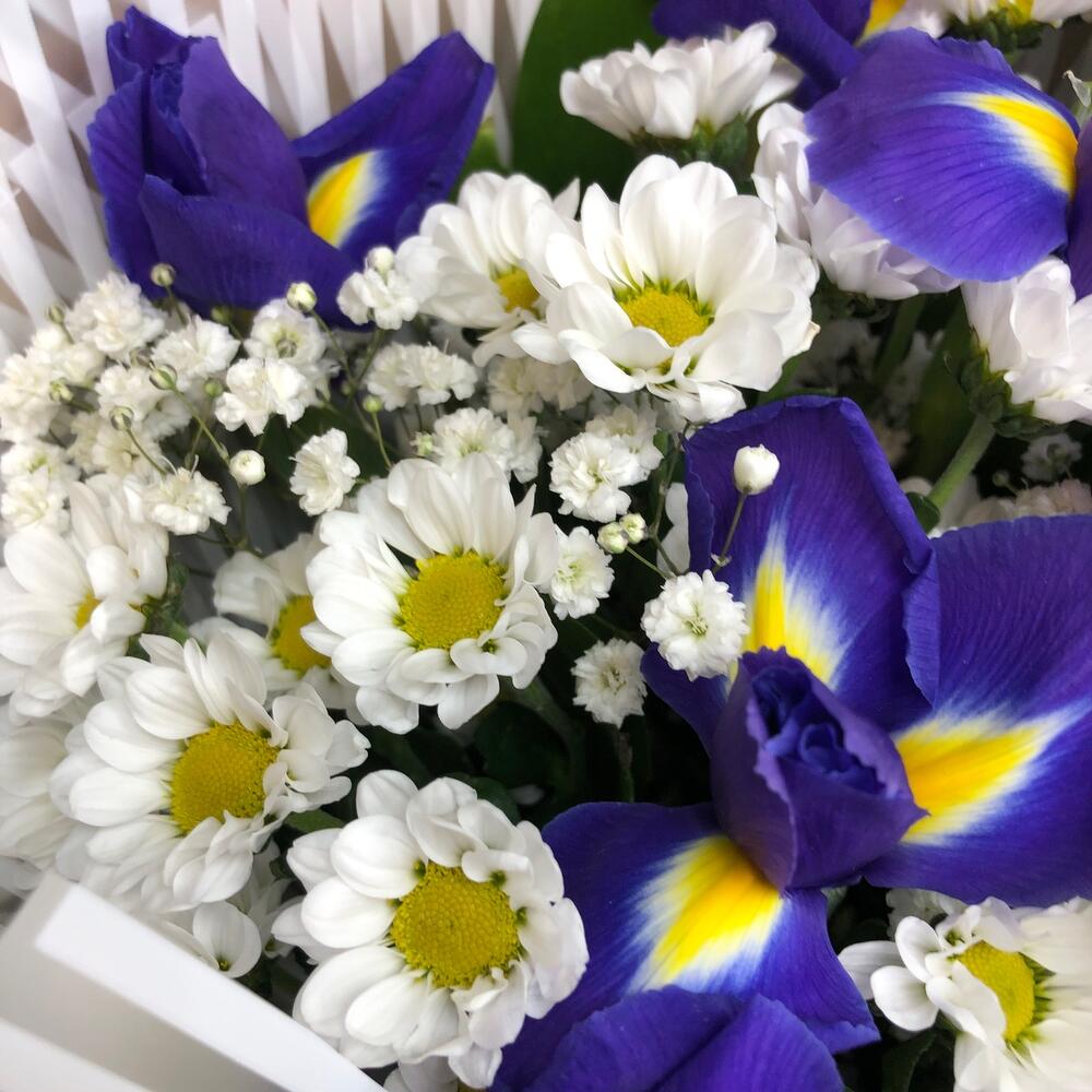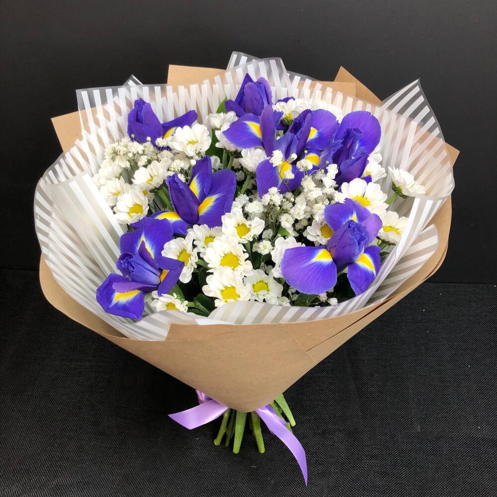 Сантини – 5 шт.Ирис – 7 шт.Гипсофила – 1 шт.Рускус – 5 шт.Крафт – 1 шт.