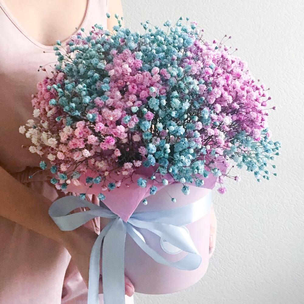 гипсофила цветная микс – 6 шт.Коробка шляпная – 1 шт.Лента атласная – 1 шт.Оазис флористический – 1 шт.Тишью – 4 шт.инструкция по уходу за цветами – 1 шт.упаковка транспортировочная – 1 шт.