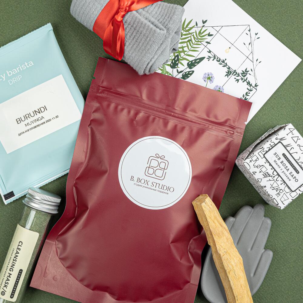 маска в колбе laboratorium – 1 шт.мыло laboratorium – 1 шт.подставка-ладошка для благовоний из гипсофила – 1 шт.благовоние пало санто – 1 шт.ароматная соль для ванной bbox.studio – 1 шт.носочки универсального размера – 1 шт.дрип-кофе – 1 шт.