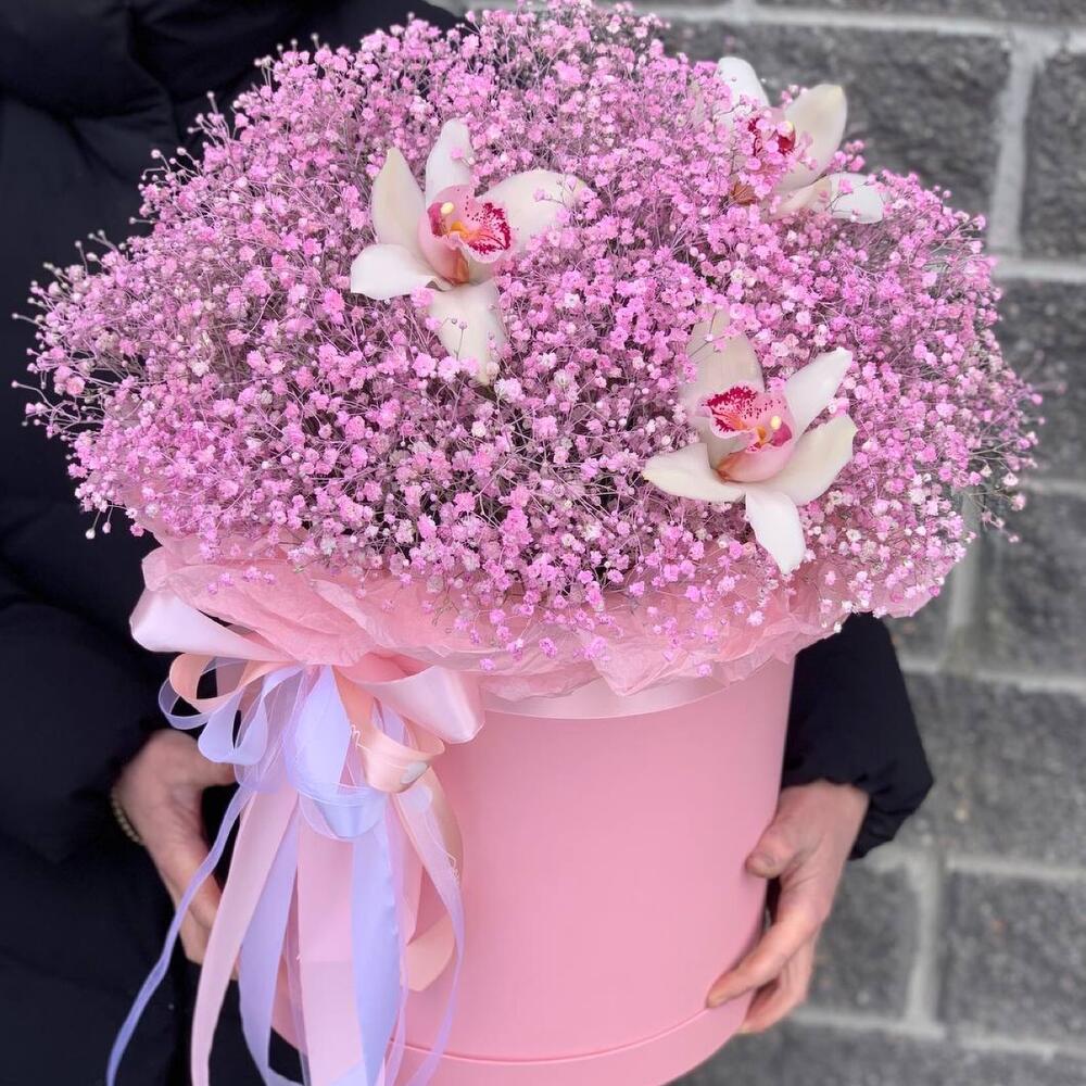 Гипсофила – 10 шт.Орхидея Цимбидиум – 3 шт.Коробка шляпная – 1 шт.Оазис флористический – 2 шт.Пленка матовая – 1 шт.Тишью – 3 шт.Лента атласная – 4 шт.
