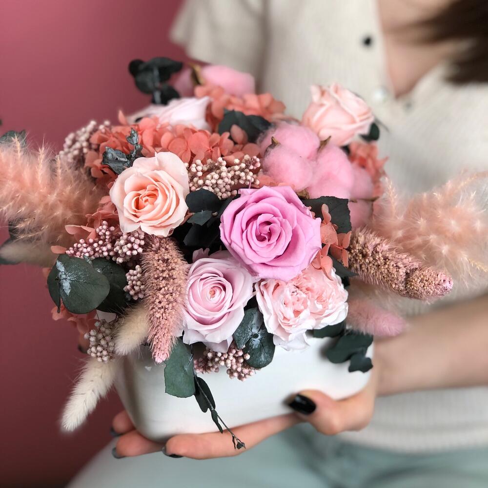 Композиция авторская из стабилизированых цветов. Ваза керамическая.Не требует ухода и полива, срок жизни 5-7 лет при соблюдении рекомендаций.