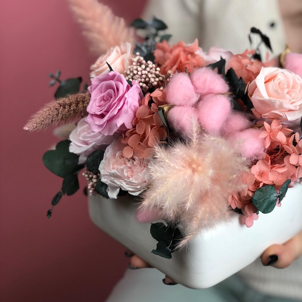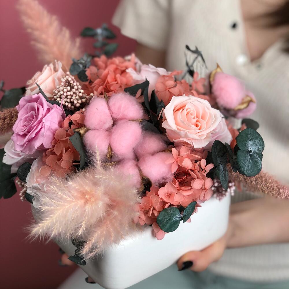 Хлопок – 5 шт.Керамическое кашпо – 1 шт.гортензия стабилизированная – 20 гр.рисовый цветок – 2 шт.стабилизированные цветы микс – 21 шт.