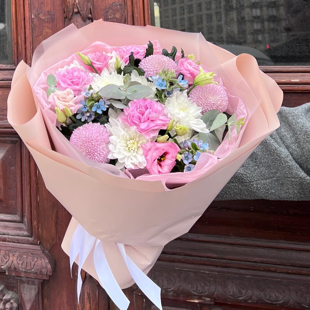 эустома розовая махровая – 1 шт.Оксипеталум – 3 шт.Хризантема момоко – 3 шт.Хризантема кустовая – 2 шт.Диантус – 3 шт.Эвкалипт – 1 шт.Тишью – 1 шт.Пленка матовая – 5 шт.Лента атласная – 2 шт.