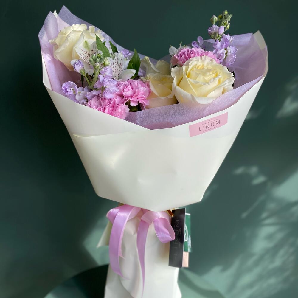 роза кендилайт – 4 шт.Маттиола – 4 шт.Гвоздика – 3 шт.Альстромерия – 2 шт.Упаковка дизайнерская – 1 шт.Открыточка с вашими пожеланиями – 1 шт.транспортировочная упаковка – 1 шт.уходовое средство для цветов – 1 шт.