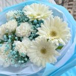 Голубой воздушный букет с герберами и диантусом