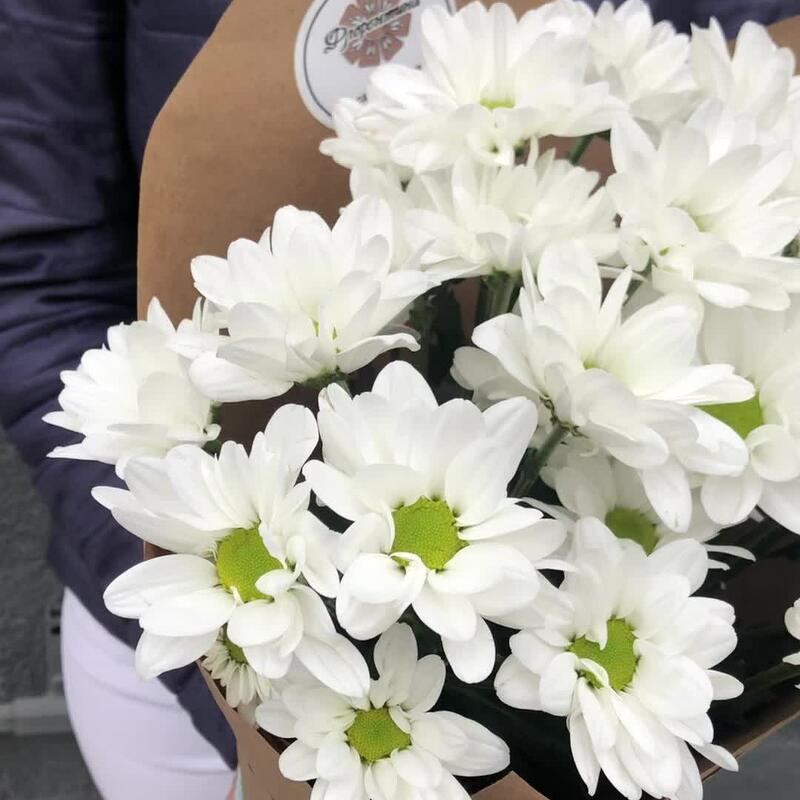 Хризантема кустовая – 3 шт.Лента атласная – 3 шт.Крафт дизайнерский – 2 шт.
