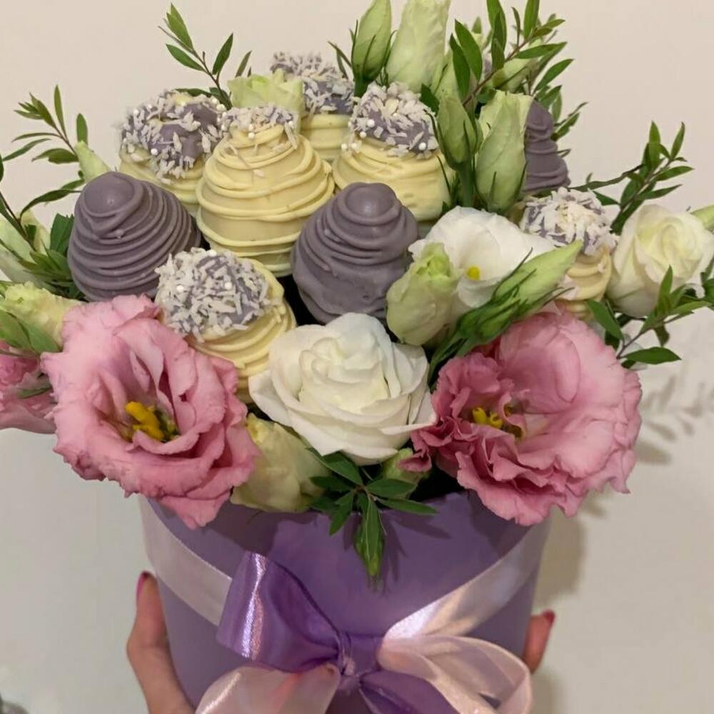 Лизиантус – 3 шт.Коробка шляпная – 1 шт.Клубника в шоколаде callebaut (бельгия) – 8 шт.Губка флористическая – 4 шт.зелень декоративная – 2 шт.ленты атласные – 1 шт.упаковка транспортировочная – 1 шт.