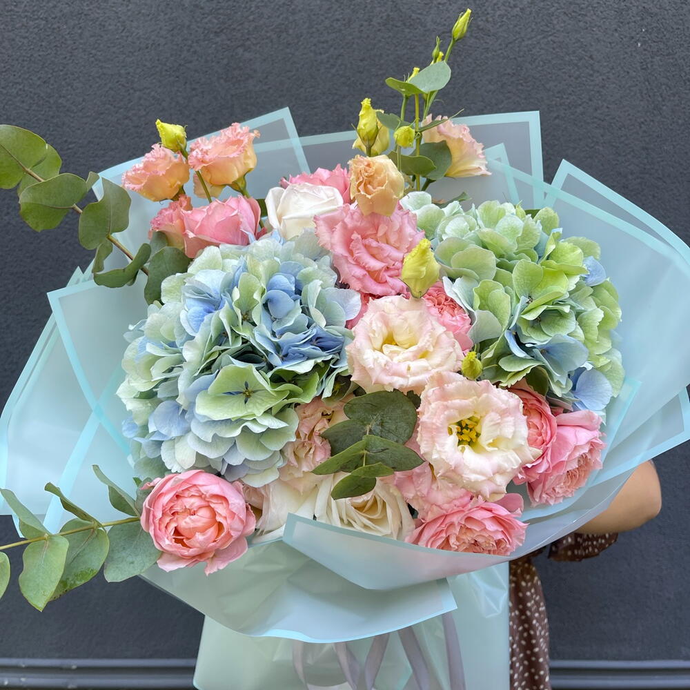 Гортензії додають об'єму та текстури, еустома принесе відтінки рожевого та білого в букеті, евкаліпт створює ароматну основу, а троянди Джульєта – надають романтичного шарму завдяки своїй ніжності та красі.