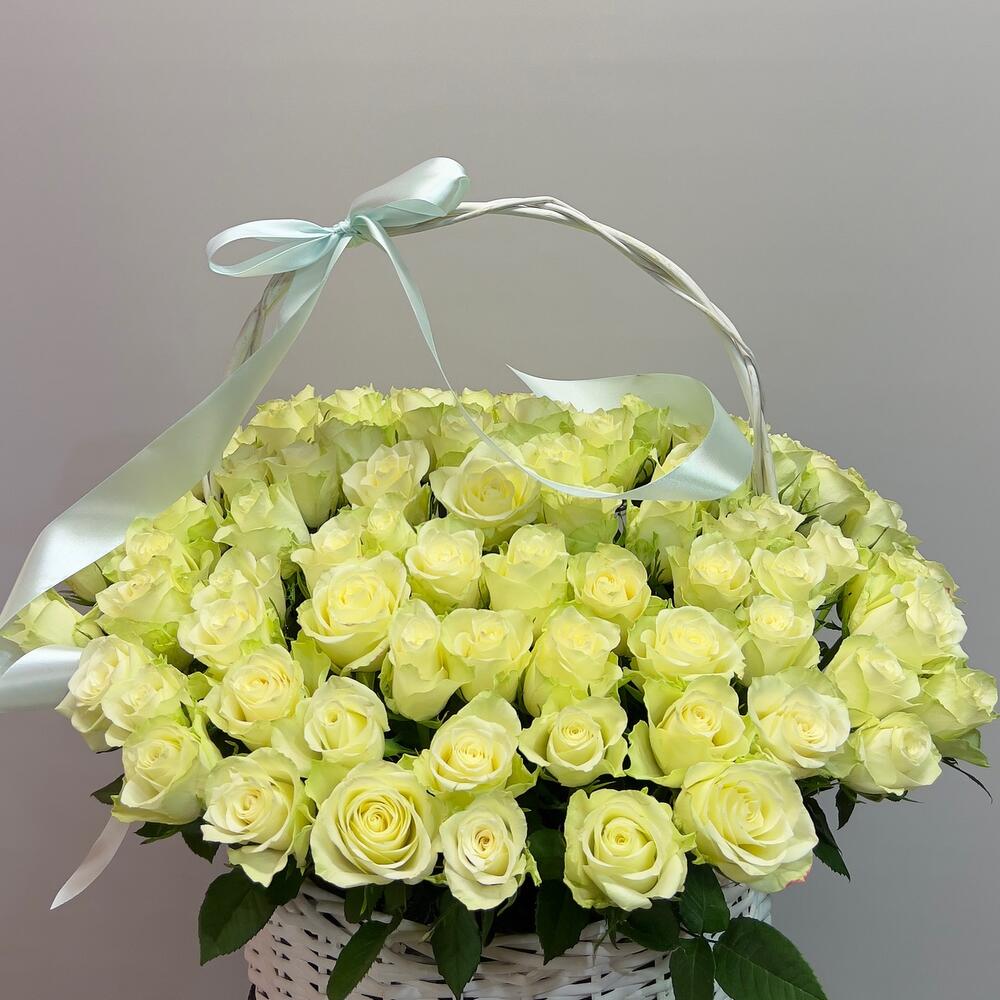 101 белая роза в корзине