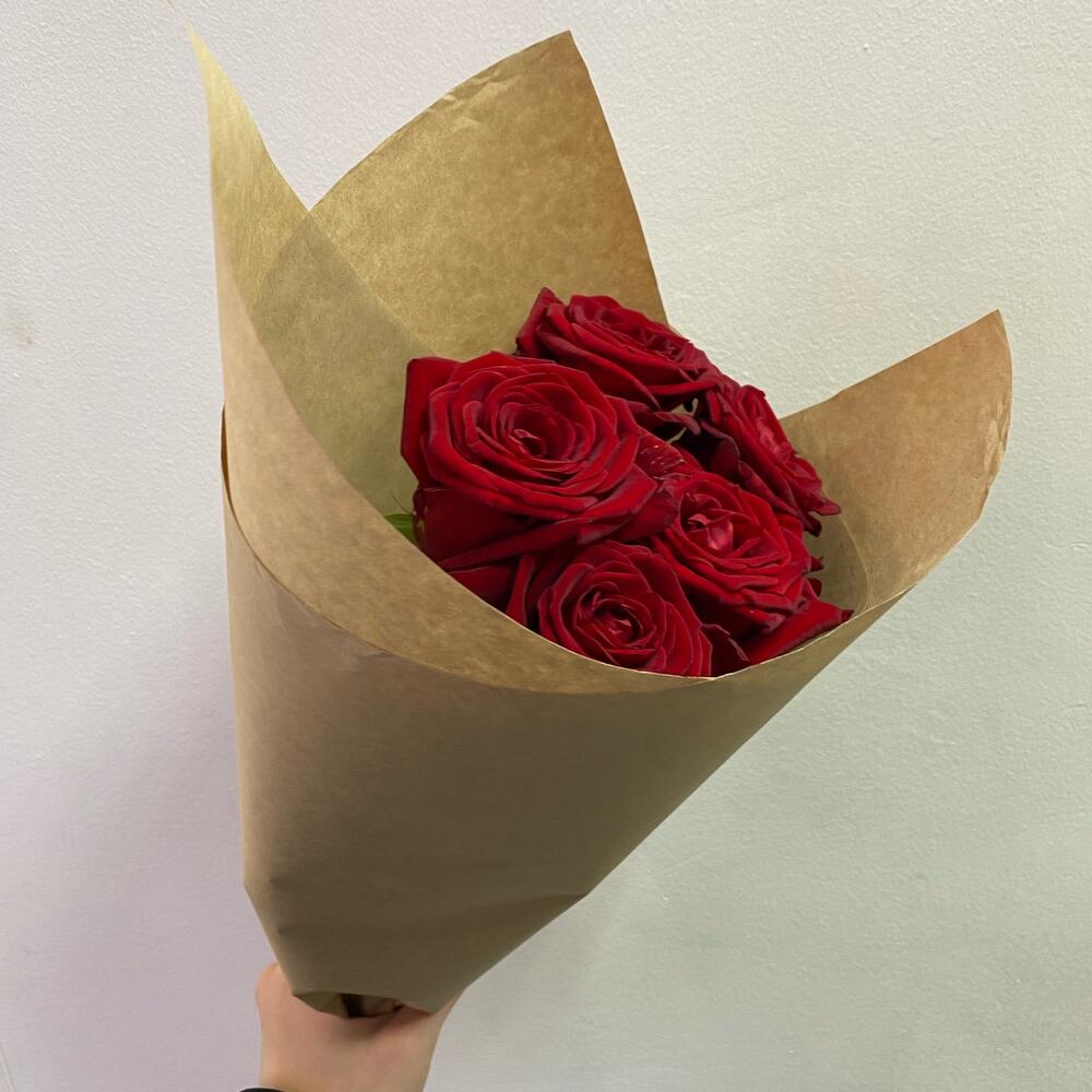 Роза красная – 5 шт.Крафт упаковка – 1 шт.Открыточка с вашими пожеланиями – 1 шт.