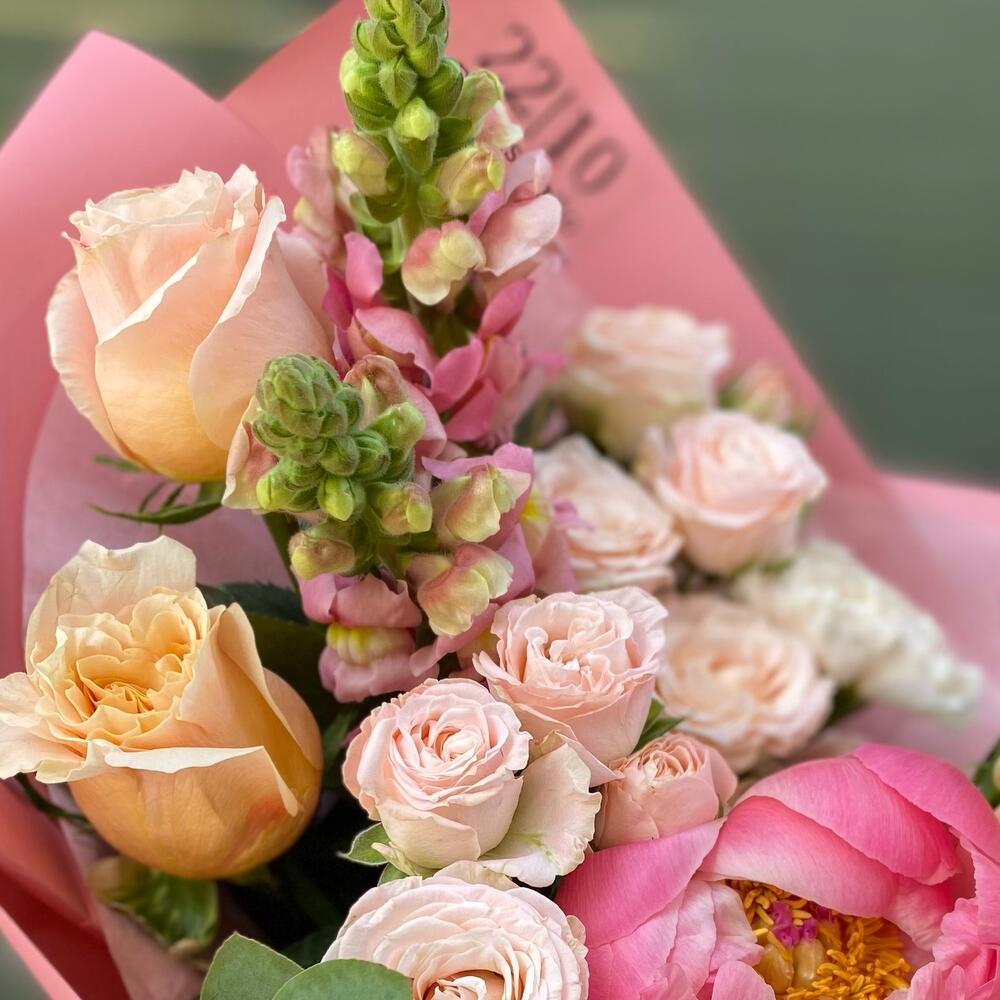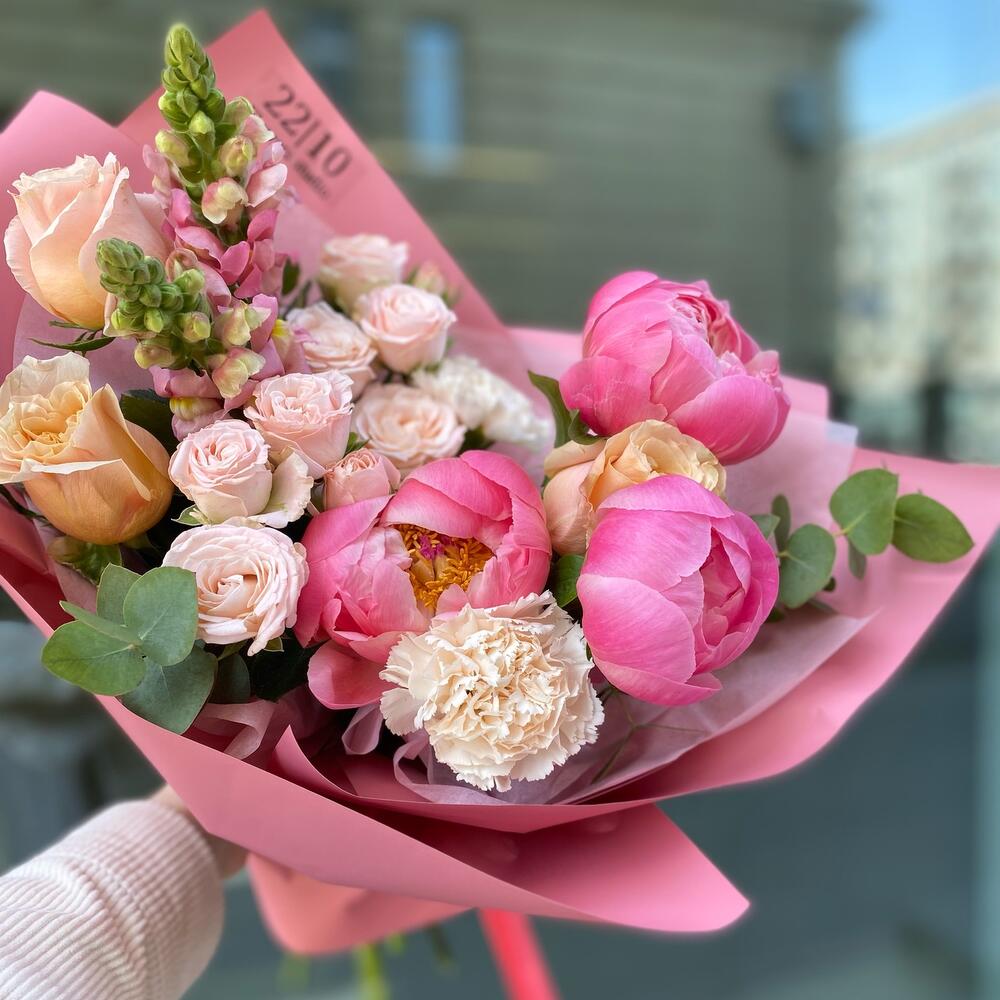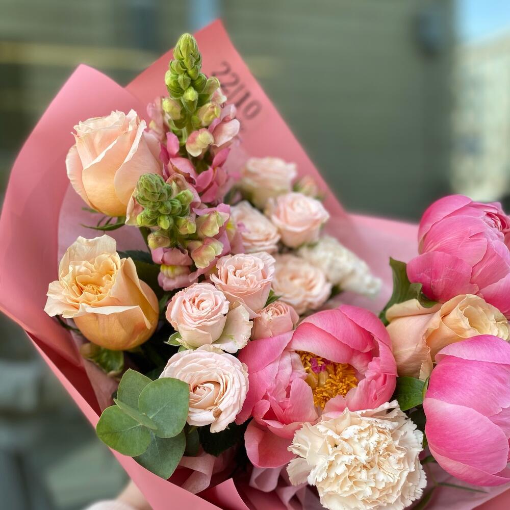 Пион Коралл Шарм (Coral Charm) – 3 шт.Роза шиммер – 3 шт.Диантус сортовой – 3 шт.антиринум – 2 шт.Эвкалипт Микс – 2 шт.Упаковка дизайнерская – 3 шт.Лента атласная – 1 шт.Роза кустовая пионовидная бомбастик – 2 шт.
