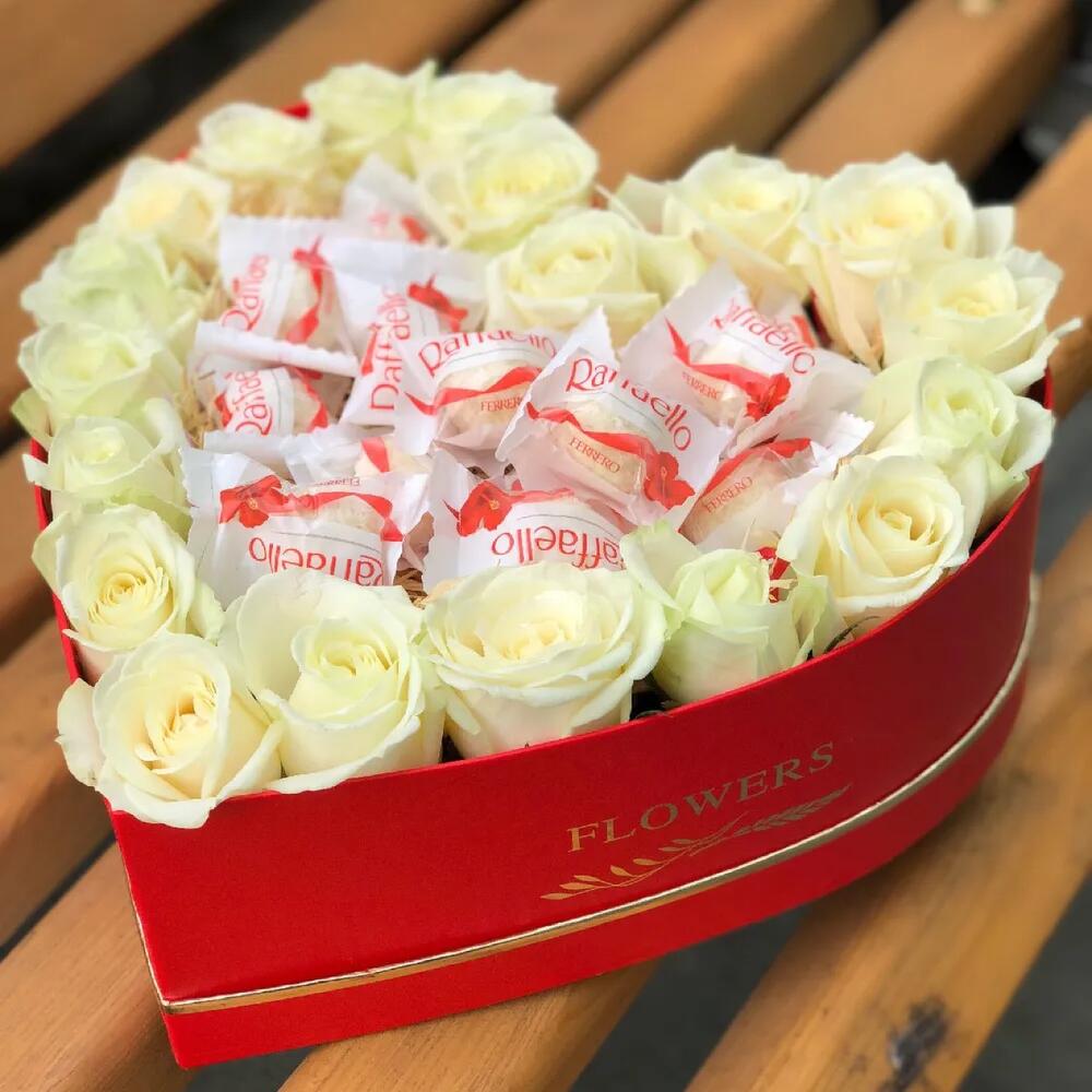 Композиция в виде сердца из белых роз и конфет рафаэло.