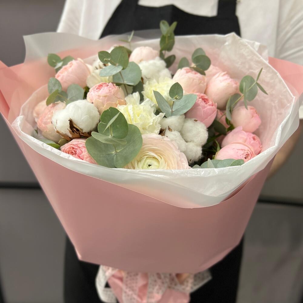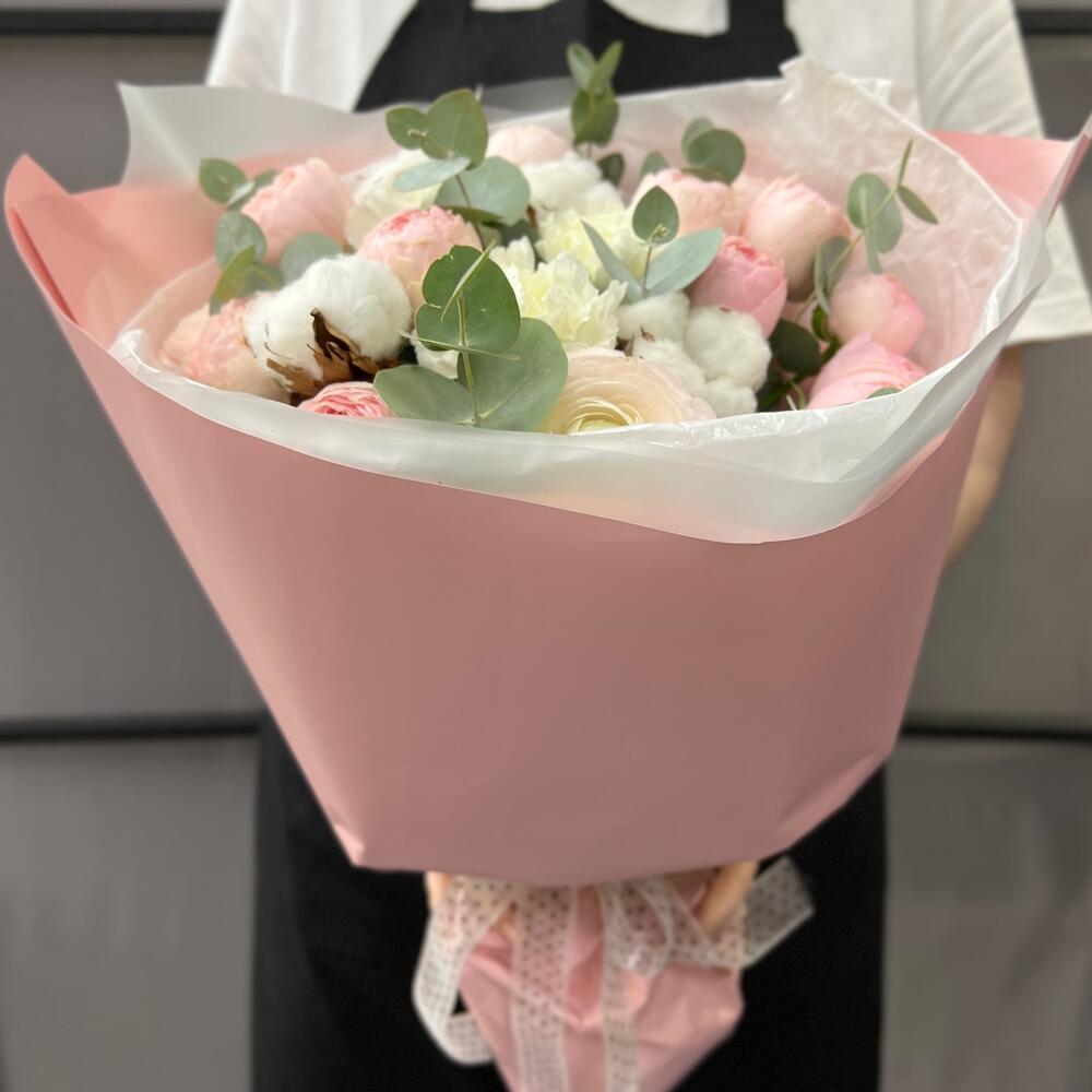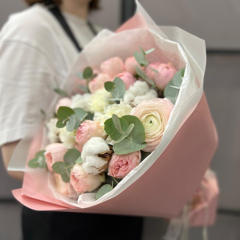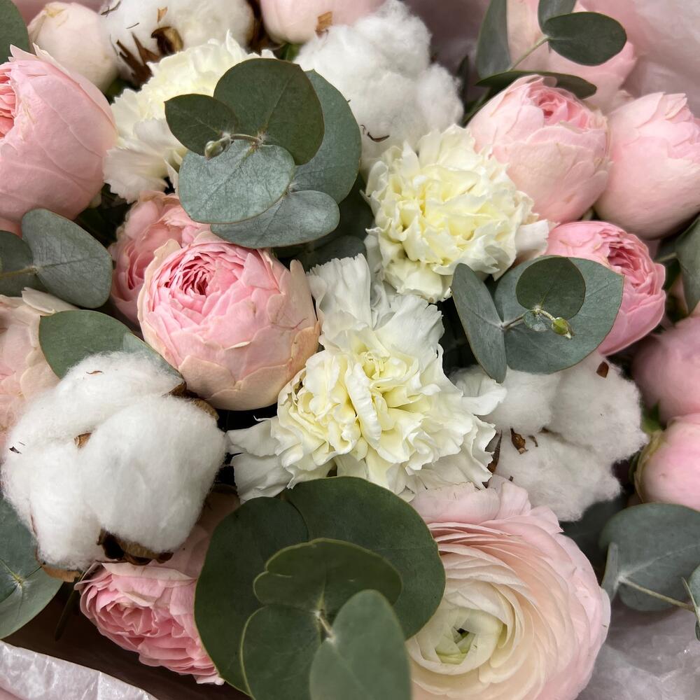Хлопок – 4 шт.Ранункулюс – 2 шт.роза пионовидная мэнсфилд парк – 3 шт.Диантус – 4 шт.Эвкалипт – 3 шт.Тишью – 3 шт.Пленка матовая – 3 шт.Лента атласная – 2 шт.