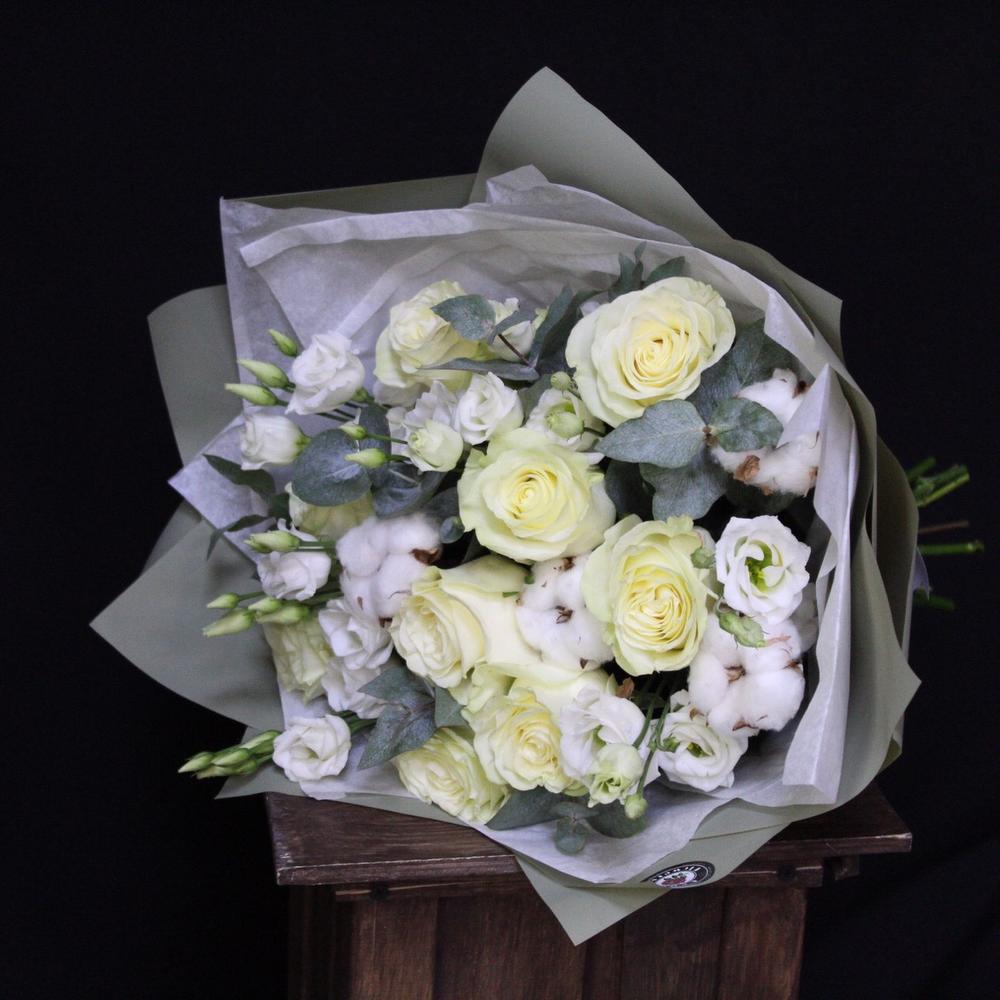 Роза Мондиаль – 9 шт.Эустома – 5 шт.Хлопок натуральный – 4 шт.Эвкалипт – 3 шт.Тишью – 2 шт.Пленка дизайнерская – 3 шт.Лента атласная – 2 шт.