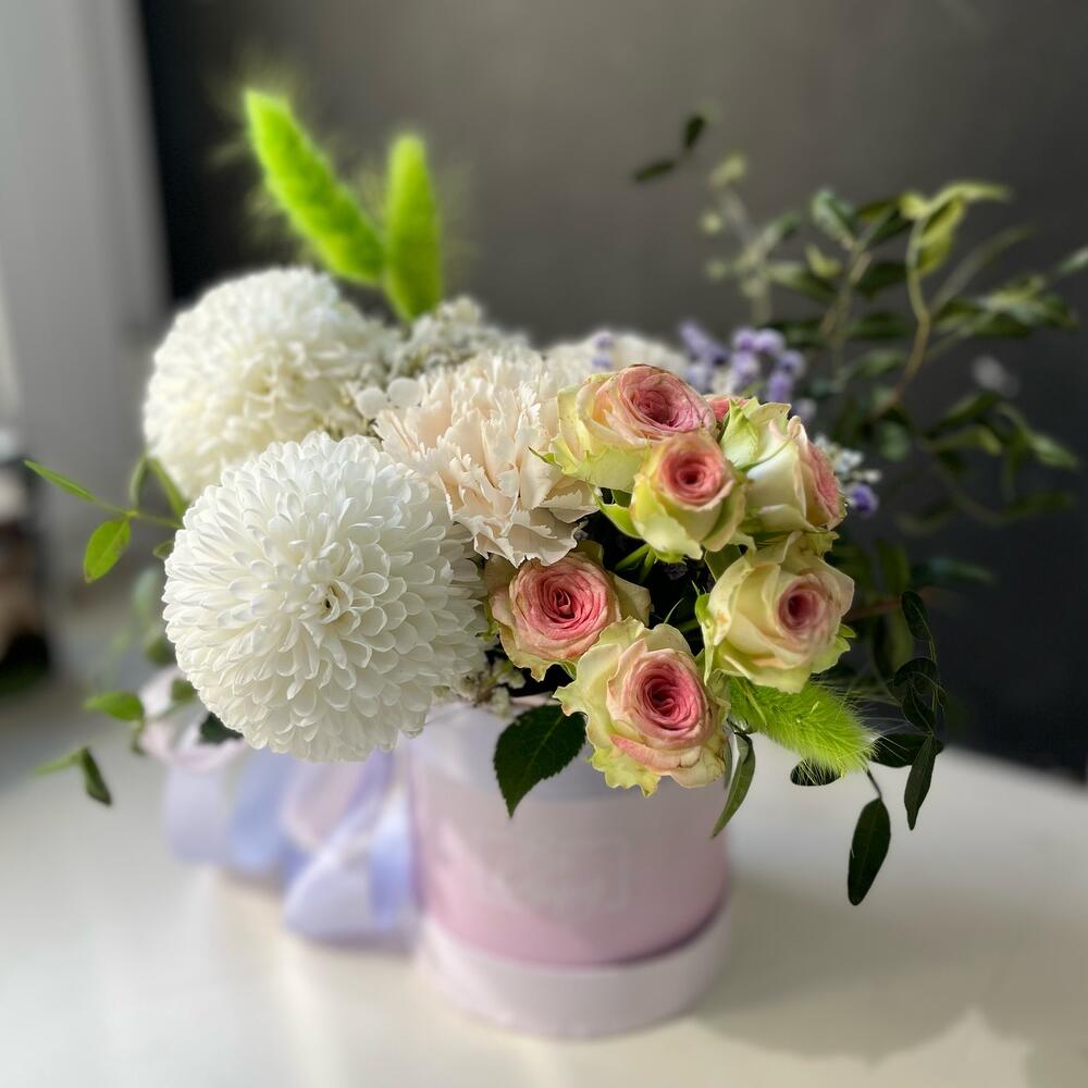 Альстромерии, Гвоздики, Кустовые розы, Лизиантусы, Розы, Хризантемы