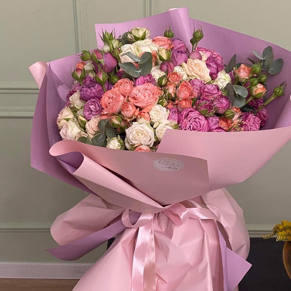 кустовые пионовидные розы – 51 шт. Упаковка дизайнерская – 5 шт. Атласная лента – 2 шт. Открыточка с вашими пожеланиями – 1 шт.