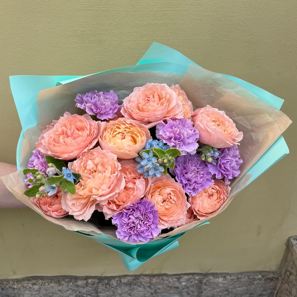 роза пионовидная премиум джульетта – 5 шт.Диантус лунный – 6 шт.твидия голубая – 3 шт.тишью крафтовое – 1 шт.упаковка корейская пленка тиффани – 1 шт.Лента атласная – 1 шт.