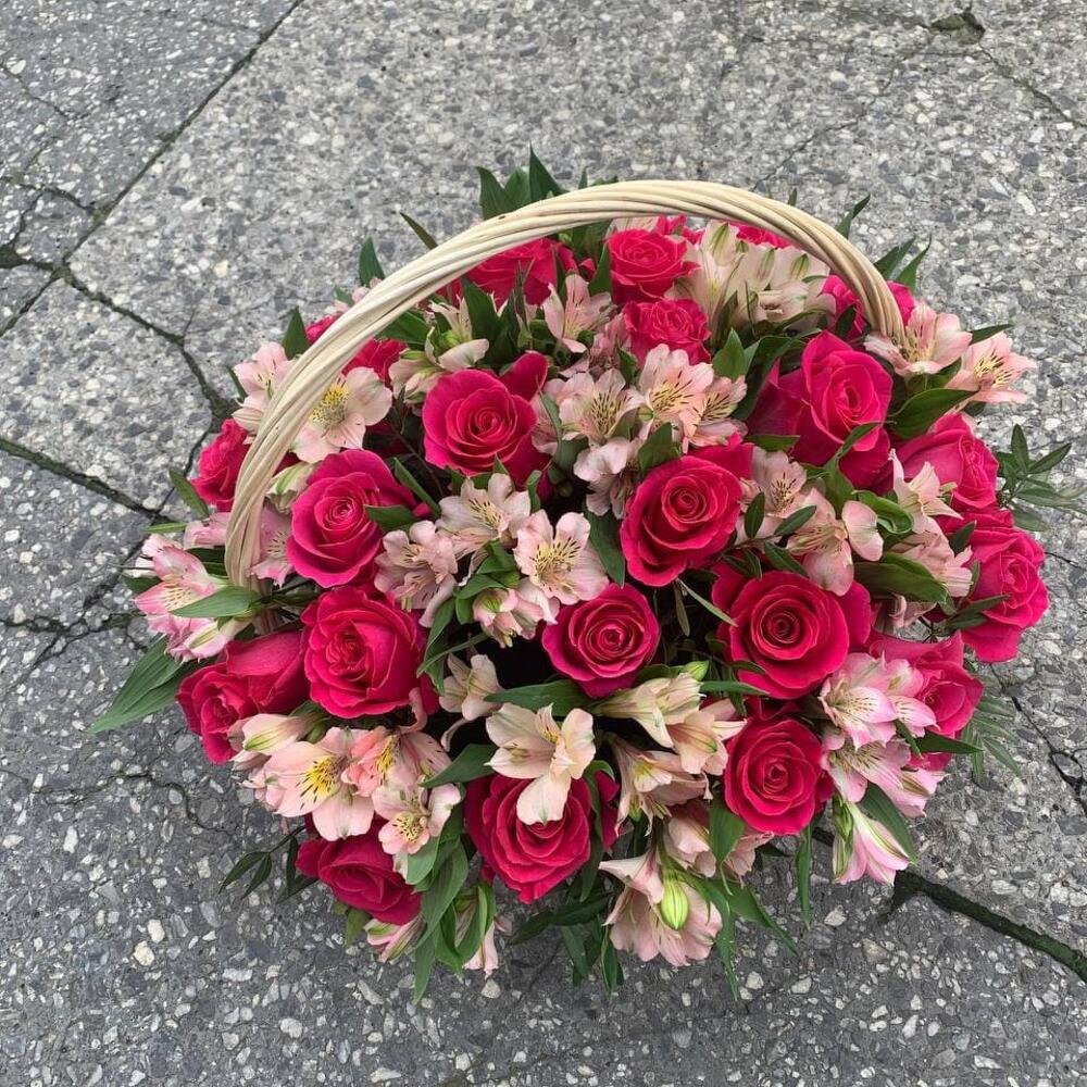Корзина из альстромерий,розовых роз и зелени Синтия