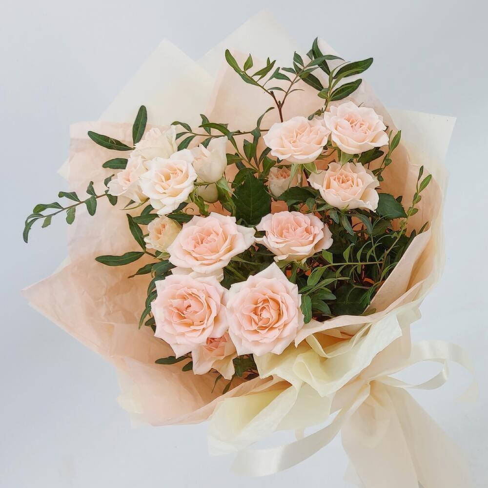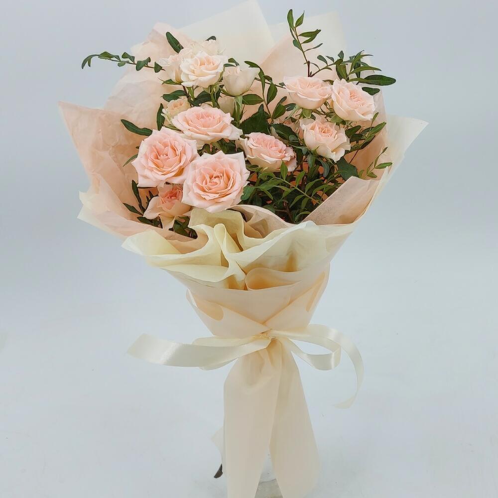Нежные кремовые кустовые розочки в стильном оформлении. Такой букет всегда уместен и подойдёт для любого повода: День Рождения, именины, годовщина свадьбы, рождение ребенка, 8 марта, День Святого Валентина, выпускной и т.д. Можно вручить маме, сестре, подруге, коллеге, учителю, любимой.