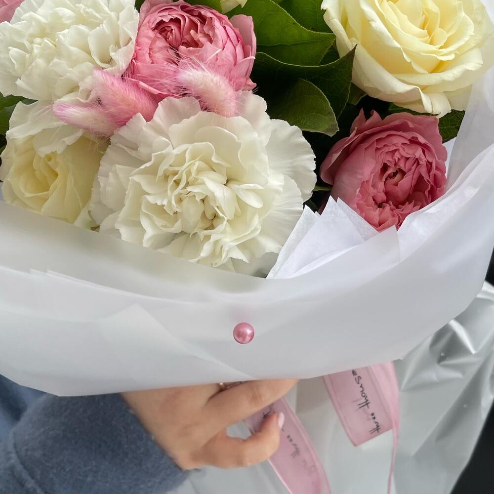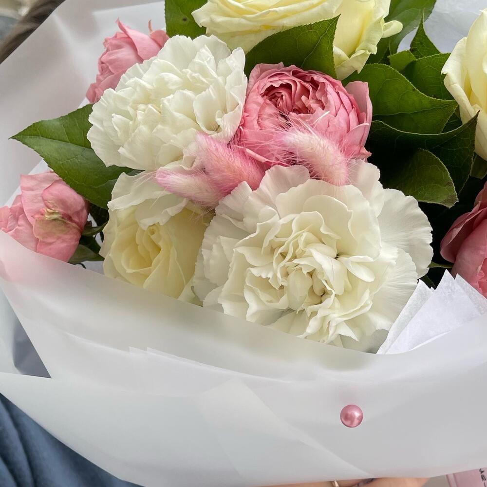 белая роза – 3 шт.Гвоздика – 2 шт.джульетта роза пионовидная – 1 шт.Салал листья – 7 шт.Тишью белое – 4 шт.Пленка матовая – 4 шт.Лагурус – 3 шт.