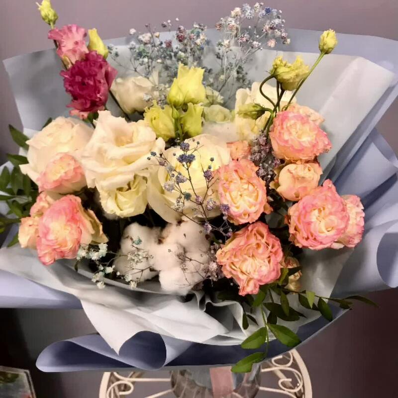 Кружевные розы, легкие шарики гипсофилв и нежные коробочки хлопка, соединились в одну нежную картину – легкую и шелковистую! Такой букет расскажет о Ваших нежных чувствах.