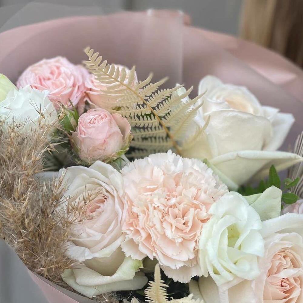 Роза белая – 3 шт.пионовидная кустовая роза bombastic – 2 шт.Сухоцветы – 5 шт.диантус brut – 2 шт.Лизиантус белый – 2 шт.