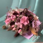 Хлопок натуральный – 3 шт.Цветы стабилизированные – 3 шт.Озотамнус розовый – 5 шт.перо декоративное – 1 шт.Эвкалипт стабилизированный – 5 шт.Лимониум – 1 шт.Лагурус – 9 шт.фаларис розовый – 9 шт.Скабиоза – 5 шт.антуриум сухоцвет – 3 шт.мак коробка – 1 шт.пампасная трава – 2 шт.Тишью – 3 шт.ленты атласные – 2 шт.