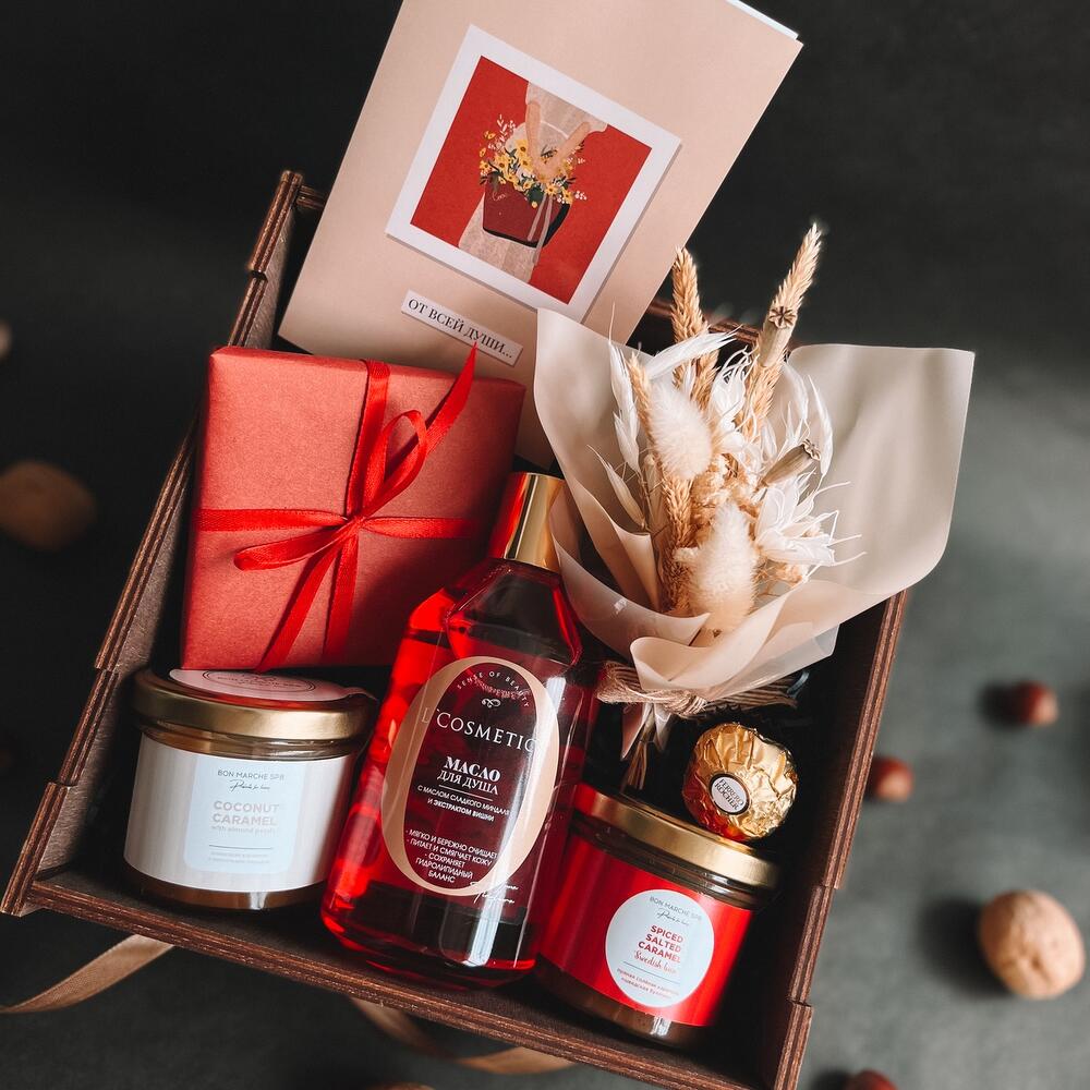 Шоколад ritter sport – 1 шт.масло для душа – 1 шт.кокосовая карамель – 1 шт.карамель шведская булочка – 1 шт.Сухоцвет – 1 шт.конфета ferrero rocher – 1 шт.