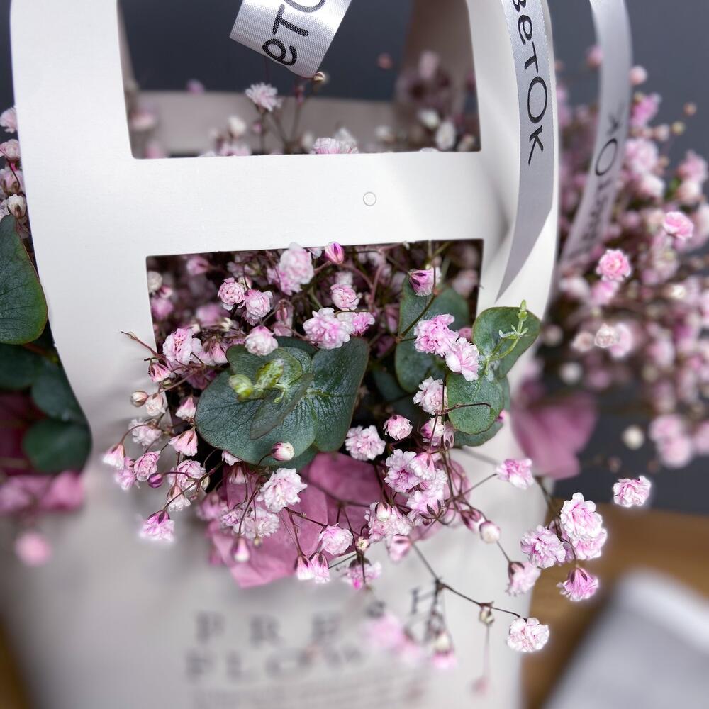 Гипсофила розовая – 4 шт.Эвкалипт ценерия – 3 шт.Лагурус (сухоцвет) – 2 шт.плайм сумка – 1 шт.